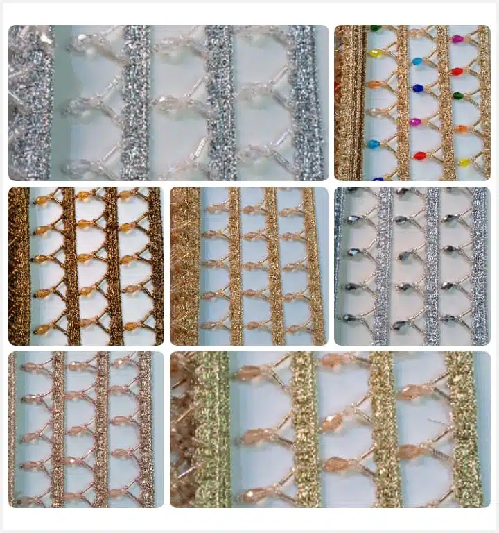 Looking for stylish and high-quality fancy laces for your fashion creations? Our V Nalki Cristal Surahi lace is designed to bring elegance, shine, and sophistication to any garment or decorative project.